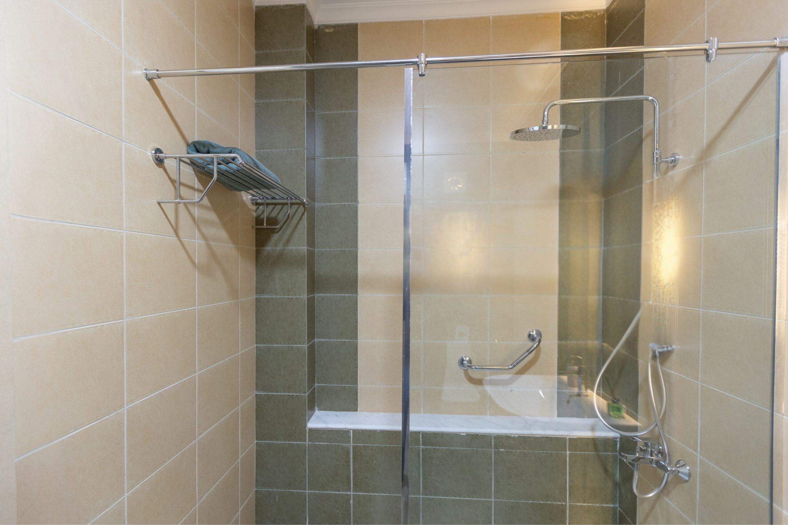 A clean, well-lit bathroom with a hot shower and all essentials for a comfortable stay: