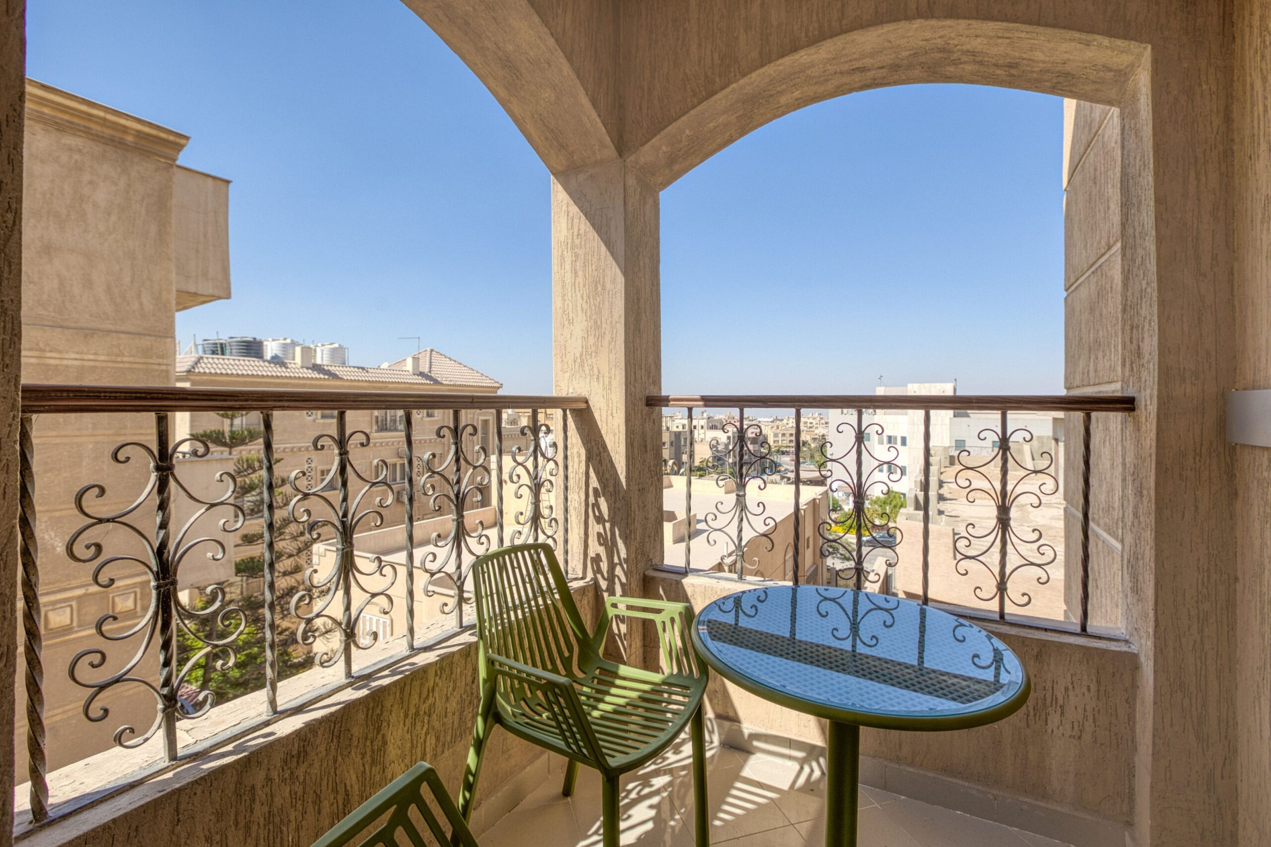 A cozy balcony with a relaxing atmosphere, ideal for enjoying a morning coffee or unwinding with a book while taking in the city vibes, overlooking the main street.